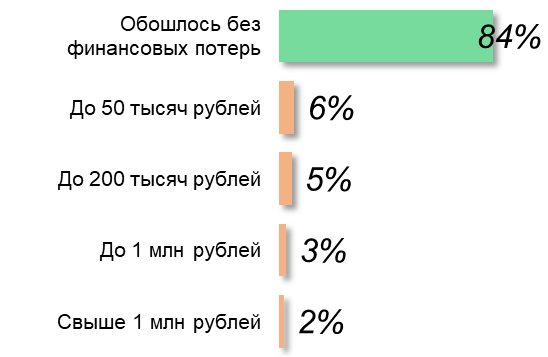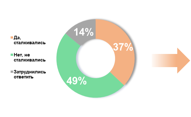 49% опрошенных не сталкивались с финансовыми мошенниками за последний год, 37% – сталкивались с ними. При этом 84% респондентов, столкнувшихся с мошенниками, финансового не пострадали, 16% потеряли деньги.