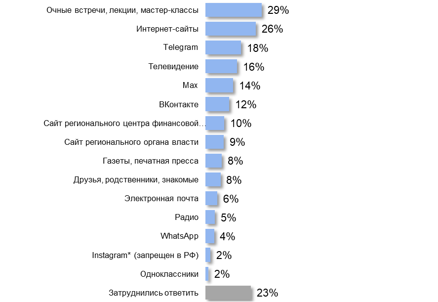 Удобнее всего респондентам получать знания на очных встречах (29%), интернет-сайтах (26%), в Telegram (18%), по телевидению (16%) и в MAX (14%). Менее привлекательны в качестве источников информации мессенджер WhatsApp (4%), социальные сети Instagram* (2%) и Одноклассники (2%).