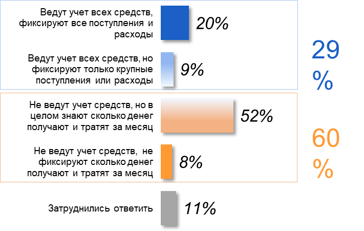 60% опрошенных не ведут семейный бюджет, 29% ведут, 11% затруднились с ответом. При этом 52% опрошенных отметили, что не ведут семейный бюджет, но в целом знают, сколько денег получают и тратят за месяц, а 8% – не ведут совсем и не планируют доходы и расходы. Каждый пятый (20%) ведет учет всех средств, фиксирует все финансовые поступления и расходы.