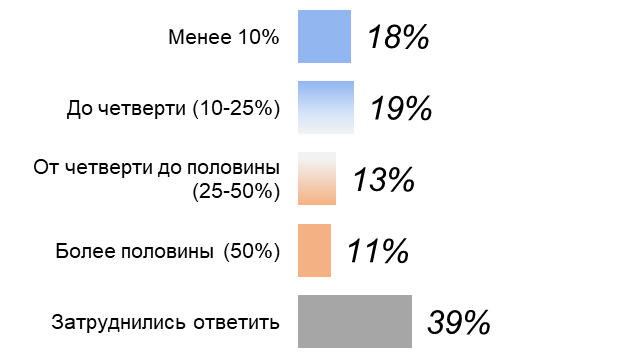 Более половины опрошенных (54%) имеют на данный момент кредиты, 34% – не имеют кредитных долгов, 12% затруднились ответить. Из респондентов, оформивших кредиты, 48% имеют один-два кредита, 13% – три и более кредита. При этом 16% респондентов оценивают свою кредитную нагрузку как низкую, 25% – как среднюю, 4% – как высокую. 18% респондентов отметили, что выплаты по кредитным долгам составляют менее 10% от семейного бюджета, 19% – до четверти семейного бюджета, 13% опрошенных отметили, что кредитная нагрузка на их бюджет составляет 25-50%. Для каждого десятого (11%) такая нагрузка составляет более половины общего бюджета.