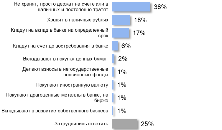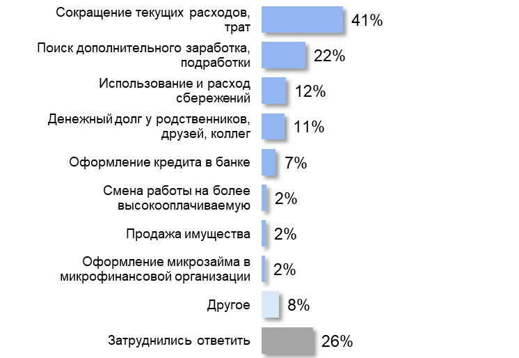 В случае нехватки денег 41% респондентов сокращают текущие расходы и траты, 22% ищут подработки, 12% расходуют сбережения, 11% берут в долг у родственников и друзей, 7% оформляют кредит в банке. Реже в таких ситуациях респонденты продают имущество (2%), меняют работу на более высокооплачиваемую (2%), берут микрозайм в микрофинансовой организации (2%).