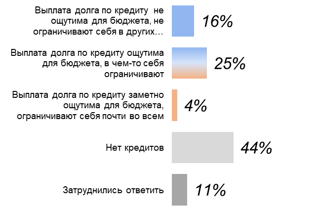 Каждый седьмой (16%), имеющий кредиты и займы в банках, отметил, что выплата долгов не ощутима для семейного бюджета и не сказывается на покупательской способности их семьи /домохозяйства. Четверть (25%) опрошенных, напротив, ощущает кредитную нагрузку на своем бюджете и им приходится себя в чем-то ограничивать. 4% респондентов отметили, что выплата по кредитному долгу заметно ощутима, что сказывается на сокращении трат по всем статьям расходов семьи.